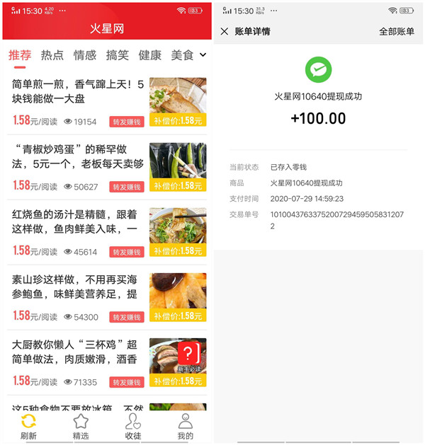 转发文章赚钱原理就是官方会在一些正规的文章资讯内插入少量的正规广告,用户转发至微信,好友阅读的同时等于做了广告宣传,自然可以获得佣金,目前火星网转发单价全天保持1.58元/阅读,假如一篇文章有100个好友阅读,那么单次就能挣158元,且每天可做,轻松在家实现零花自由!