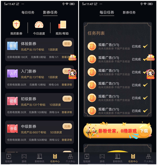 1、用户在影粉世家平台的“每日任务”中,完成当日全部任务,即可获得影券任务所对应的当天粉钻全部产出收益。