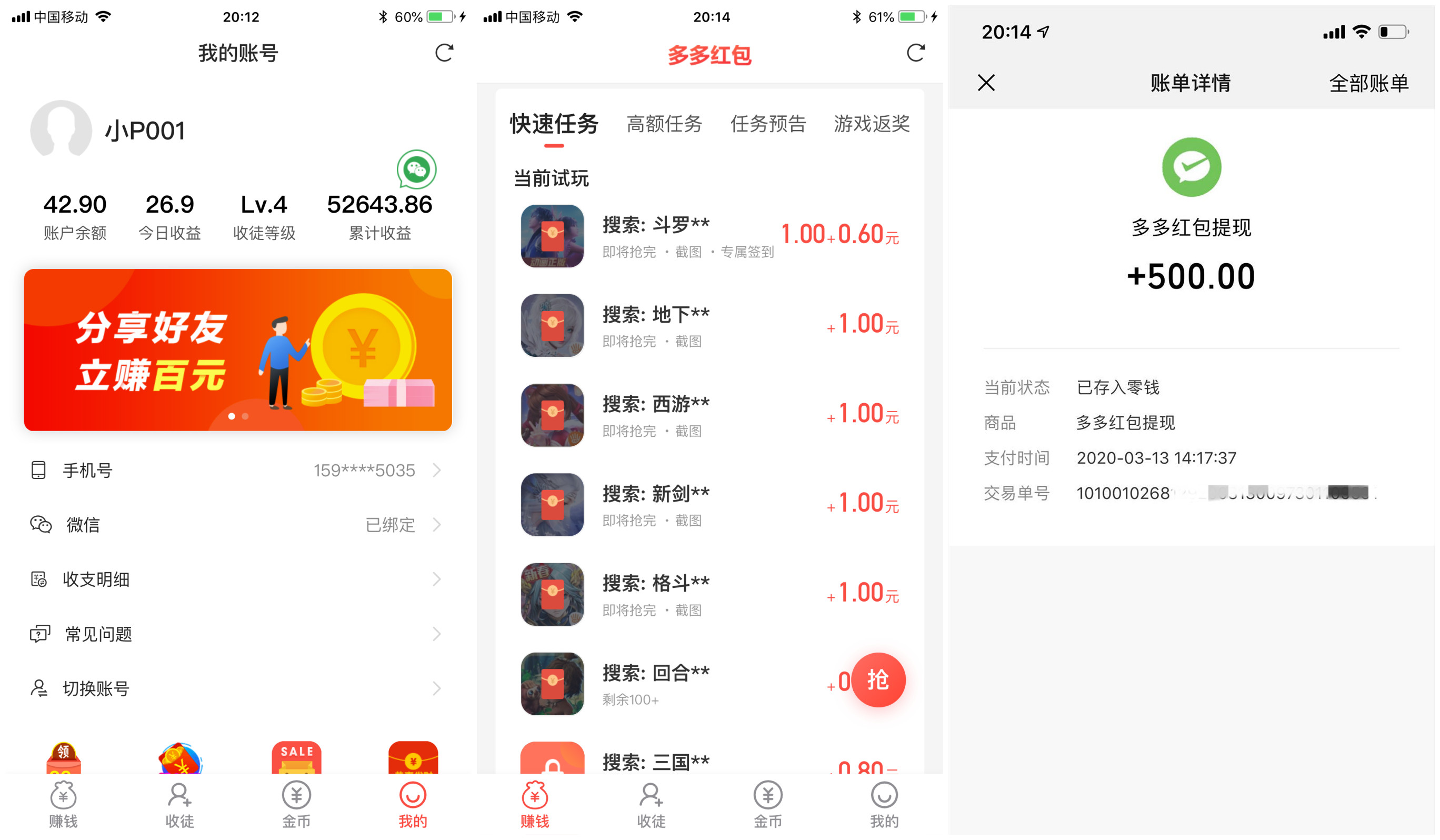 多多红包 任务和提现截图