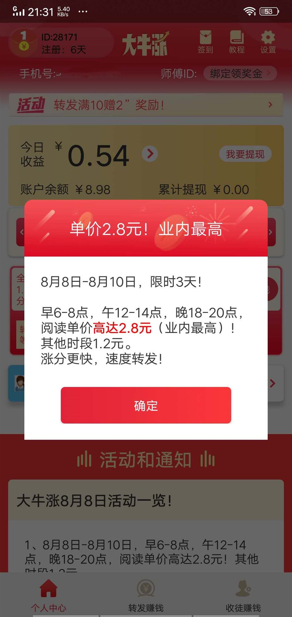 大牛涨APP不但转发单价行业之最,而且配合了丰富的福利活动,转发收入满10元送元、满20元送4元...满100元送20元;另外还有首届收徒大赛,瓜分10万现金巨奖!