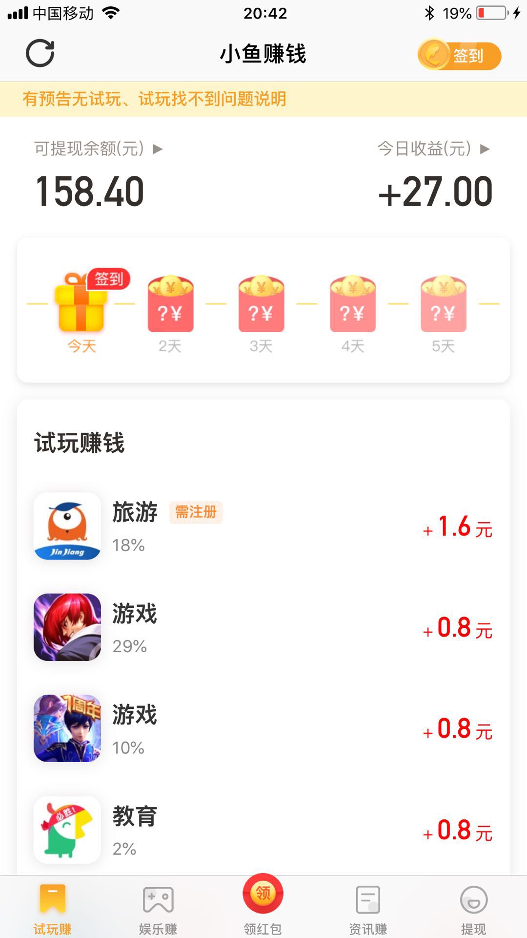 第二步:进入小鱼赚钱,可以绑定下手机号,防止资金丢失,然后接试玩任务,按照任务给出的流程按部就班操作即可,可以看到小编今天的收入有27元,你来你也可以的;