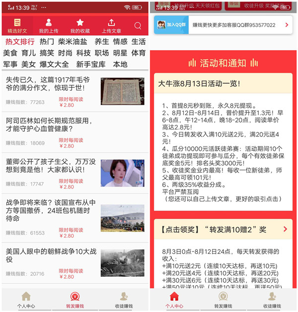 大牛涨APP是抢先收旗下8月份推出的一款超高价转发文章赚钱平台,相比旗下的同类平台收入都要高一些,而且活动力度相当大!如果你现阶段还在做单价几毛的转发赚钱APP,完全可以更换为这款大牛涨转发软件,收益可以翻几翻,前提是不作弊的情况,因为平台虽然收入高,但是对于互阅、刷点击审核是非常严格的!