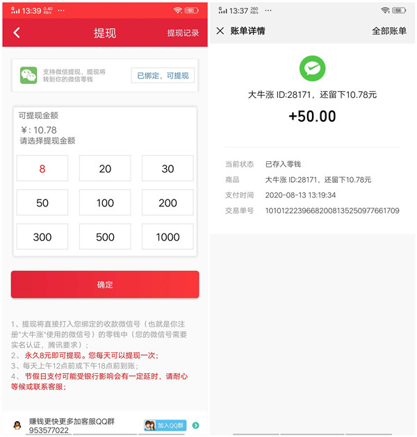 大牛涨提现门槛也是比较低的,转发收入满8元就能申请微信提现,一般24小时内就能到账且不收取手续费!小编就在发帖之前提现了一笔50元,2小时后就成功到账了,非常靠谱!
