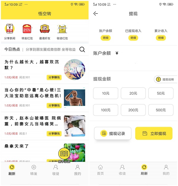 悟空转每天提供全国各地的优质新闻内容,中间插入少量的正规广告,用户可以有选择的将你喜欢的文章转发至微信,一个好友阅读赚1元,一百个好友阅读赚100元,另外长期坚持可以将单价提升至1.7元/阅读,收益丰厚,涨分迅速!