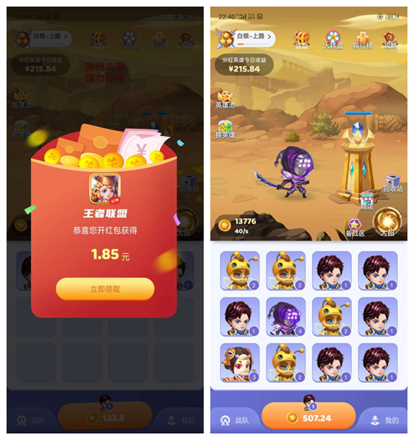 王者联盟App是一款以王者荣耀为主题的合成推塔类分红游戏,由阿里、腾讯、小米共同控股的永杨安风(北京)科技股份有限公司开发并运营,公司背景强大、实力雄厚,平台号称拿出90%利润回馈用户,2020年不可错过的游戏赚钱软件,玩家可以在游戏中进行精彩的王者对决,还会有红包奖励,让玩家边游戏边赚钱,App即将全面上线,早加入就早赚钱!