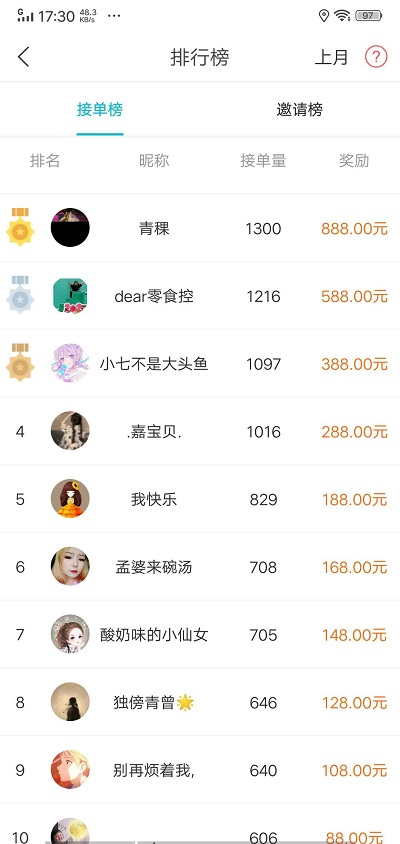 闪电帮扶任务数量算是比较多,每日签到、新手任务还能获得额外的现金奖励,我们可以看到排行榜上面,这位名为“青稞”的赚友,月做单1300单,我们就按3元/单来计算,一个月获得3900元纯收入,加上排行榜奖励第一名888元,加一起一个月零花钱就赚四千多块!