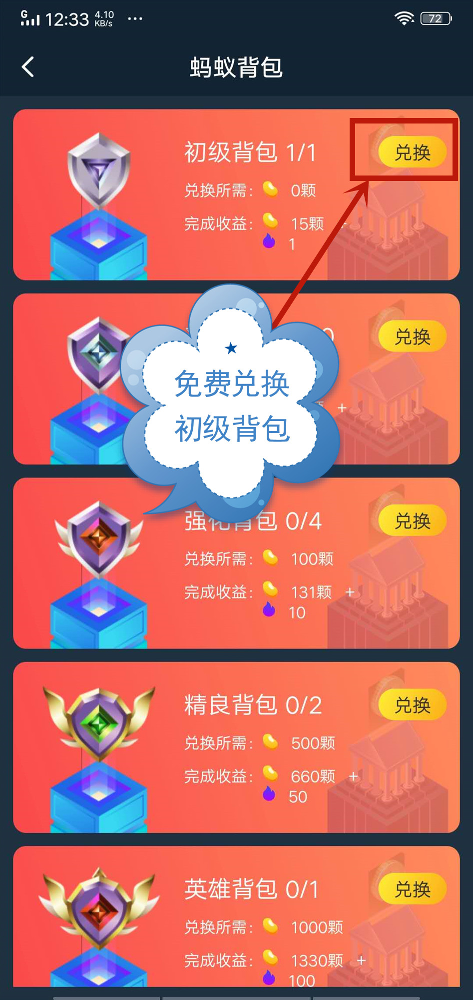 2、完成实名认证后,进入蚂蚁任务-蚂蚁背包,输入支付密码,兑换一个初级背包(兑换所需为0,等于是免费领取);