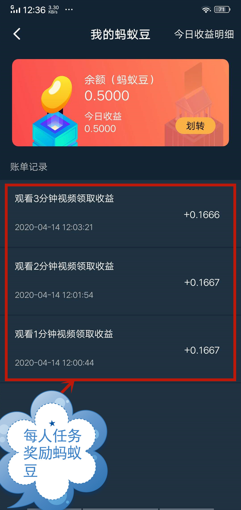 3、返回首页,观看各种趣味短视频,每一分钟可获得0.166枚蚂蚁豆,每日任务可获得3次奖励,共计0.5枚/天,周期为30天,初级背包共产出蚂蚁豆15枚,奖励可以在钱包中查看;