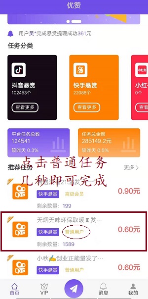 优赞App是一款新上线的短视频点赞手机赚钱软件;单价为0.6-1元,普通用户每天可领一条任务,等于每天可以撸几毛,任务一次花费大约10秒左右!最重要的是首次提现没有要求,就算你就做了一次任务,赚了1元,也能立即提现,几分钟就可以到账!