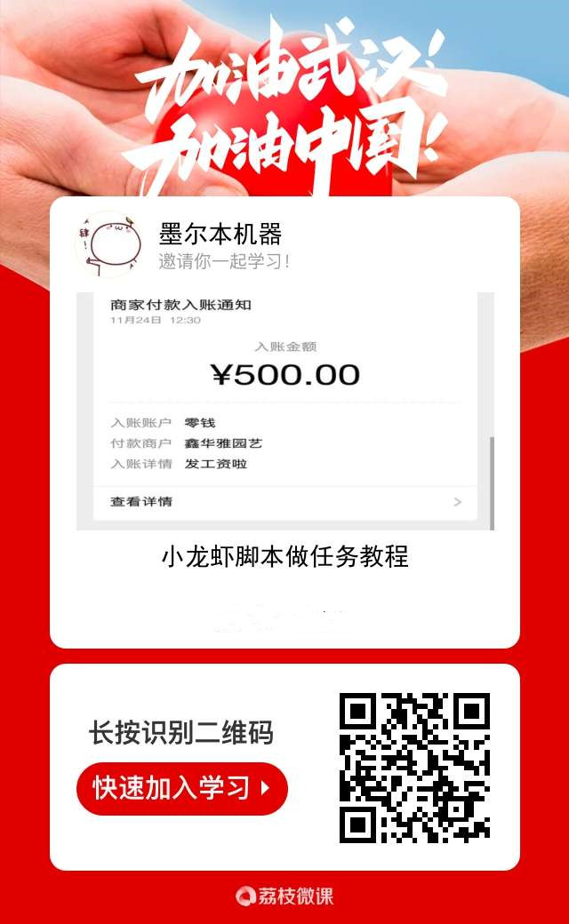 扫码关注「荔枝课堂」微信公众号,进入后预约课程,查看教程使用方法,使用这种方法,不用手动点赞关注赚钱,系统会自动接任务并完成,我们只需要每天收米就可以了哦!