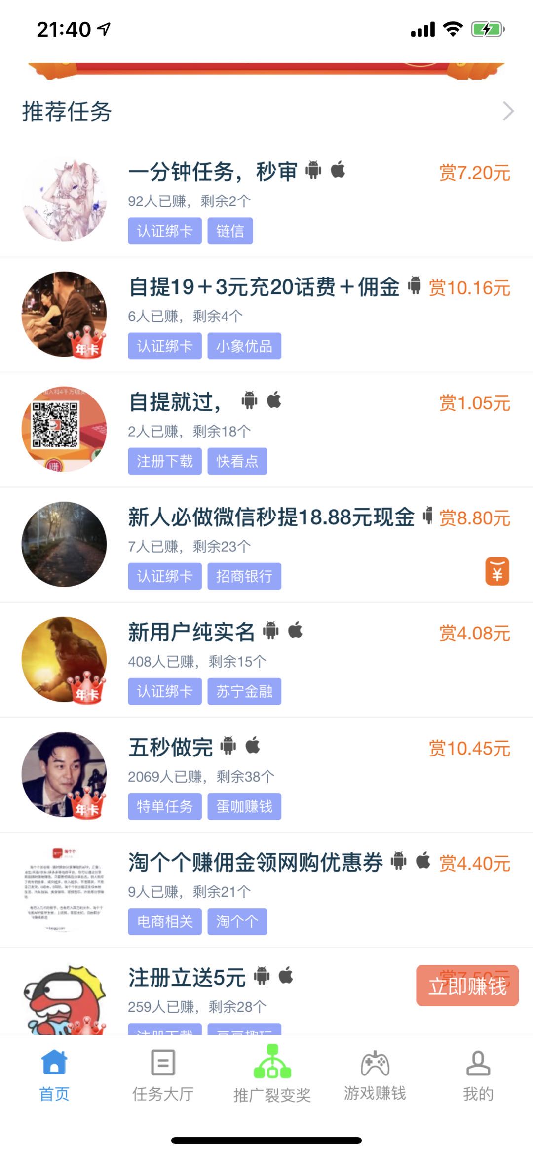 做任务赚钱也叫悬赏接单赚钱,通过完成雇主发布的注册、点赞、关注、投票等任务获得奖励,这种方式相比试玩来说种类更丰富,你可以根据你的擅长来选择任务,一次可获得1-10元左右的现金奖励,做的时间久了,效率也会非常的高!